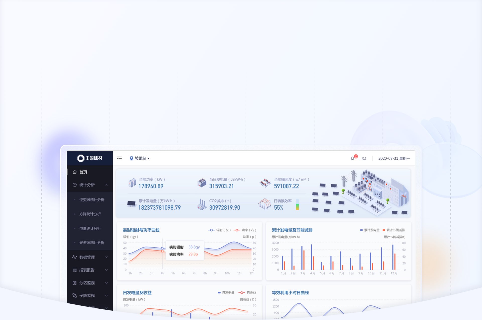 針對數(shù)據(jù)信息發(fā)生的變化,我們使用“場景化設(shè)計(jì)原則“,用立體圖標(biāo)方式繪制出從”光伏板-逆變器-交流匯流箱“發(fā)電原理圖,把數(shù)據(jù)展示在對應(yīng)的環(huán)節(jié)中,形成可視化的實(shí)時(shí)監(jiān)控圖譜。;其余與發(fā)電流程無關(guān)的數(shù)據(jù)也均以圖標(biāo)+文字的形式展示頁頁面右側(cè)。