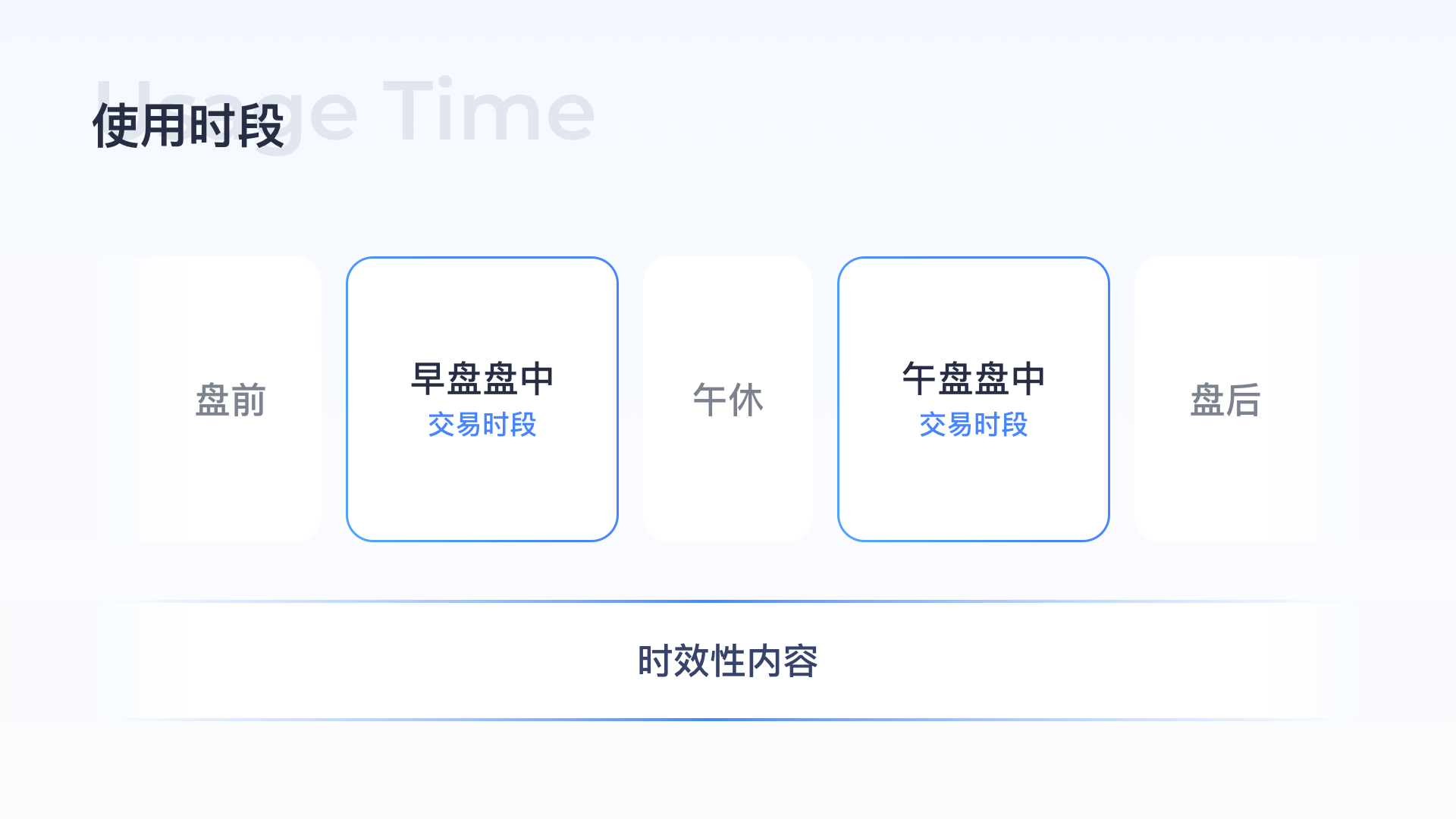 股票交易時(shí)段有固定的交易周期,包括盤(pán)前/早盤(pán)盤(pán)中/午休/午盤(pán)盤(pán)中/盤(pán)后幾個(gè)固定時(shí)段,不同時(shí)段用戶需求不同,了解不同時(shí)段的用戶需求可以更好的滿足用戶,比如開(kāi)盤(pán)過(guò)程中用戶想看到更實(shí)時(shí)更專(zhuān)業(yè)的行情信息、實(shí)時(shí)的資訊動(dòng)態(tài),而在盤(pán)前/盤(pán)后用戶更想看到的是今日大盤(pán)的走勢(shì)預(yù)測(cè)/收盤(pán)后的大盤(pán)總結(jié),除了固定周期的用戶需求,突發(fā)的新聞資訊類(lèi)時(shí)效性內(nèi)容對(duì)用戶做決策分析也很重要。