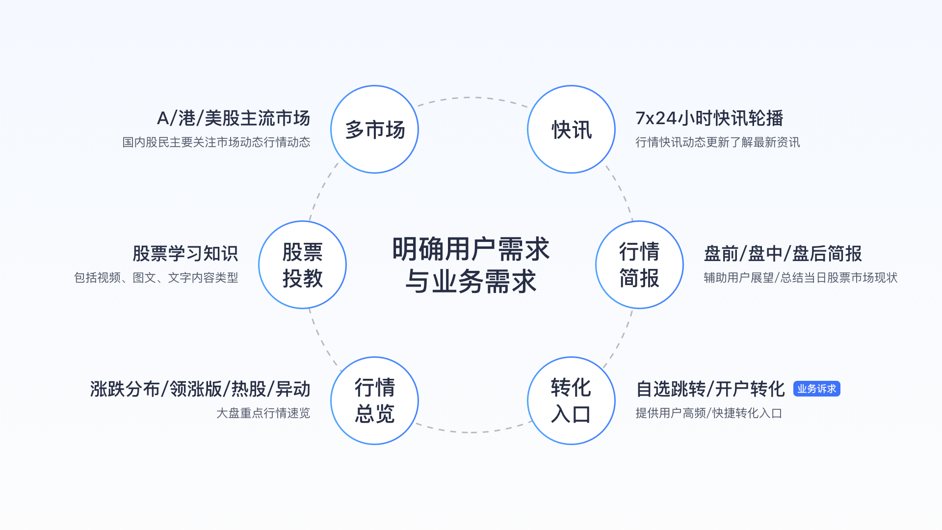 用戶需求:結(jié)合用戶高頻使用功能分析發(fā)現(xiàn)小白用戶、一般散戶、專(zhuān)業(yè)用戶均對(duì)行情功能有高頻率的使用需求,具體需求包括了解多市場(chǎng)、關(guān)鍵指數(shù)行情、了解最新快訊、重要行情動(dòng)態(tài)、盤(pán)前/盤(pán)中/盤(pán)后簡(jiǎn)報(bào),再結(jié)合小白用戶占比高且對(duì)百科內(nèi)容有需求的現(xiàn)狀,知識(shí)科普信息也是相關(guān)待滿足需求。