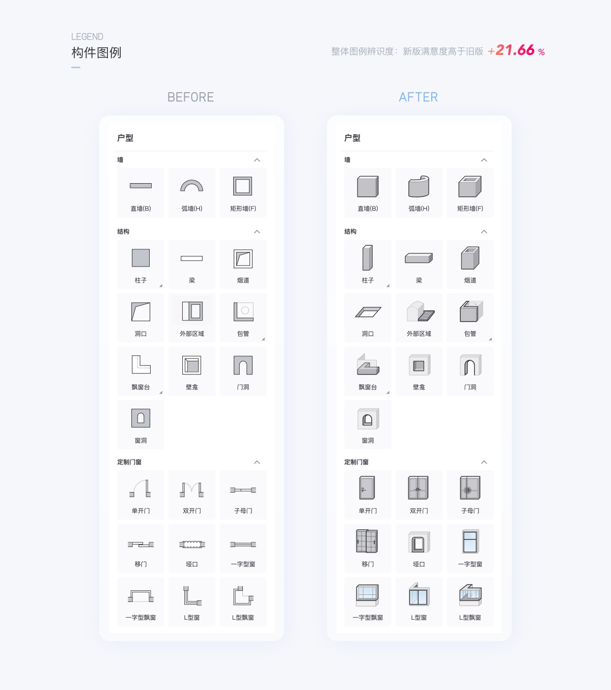 上線后通過問卷調(diào)研用戶滿意度相比舊版提升了21.66%,因此可以證明,更精準的圖形輔助用戶更高效的使用工具操作。以上是項目小組在試驗過程中的部分案例,不再一一列舉所有的試驗案例,可以看到信息表達的精準度、直觀度是能夠對業(yè)務產(chǎn)生直接的正向結果,鑒于群核下的工具產(chǎn)品有大量的應用圖標圖例,借此我們重新排查和校準了很多圖標,確保表達相對精準,提高用戶信息識別的精準度與效率。