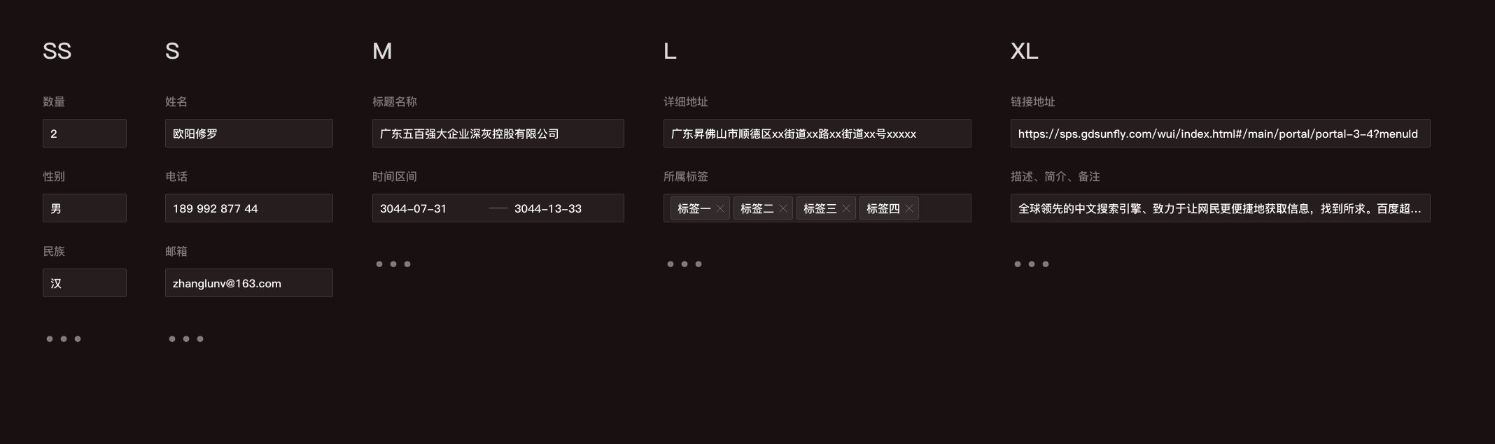 采用這樣的處理方式時,需要提前預(yù)知用戶填寫該字段內(nèi)容的最大寬度與最小寬度,中和這兩個極值選擇合適的輸入框?qū)挾取S纱宋覀儗玫?種梯度的輸入框,如下圖例