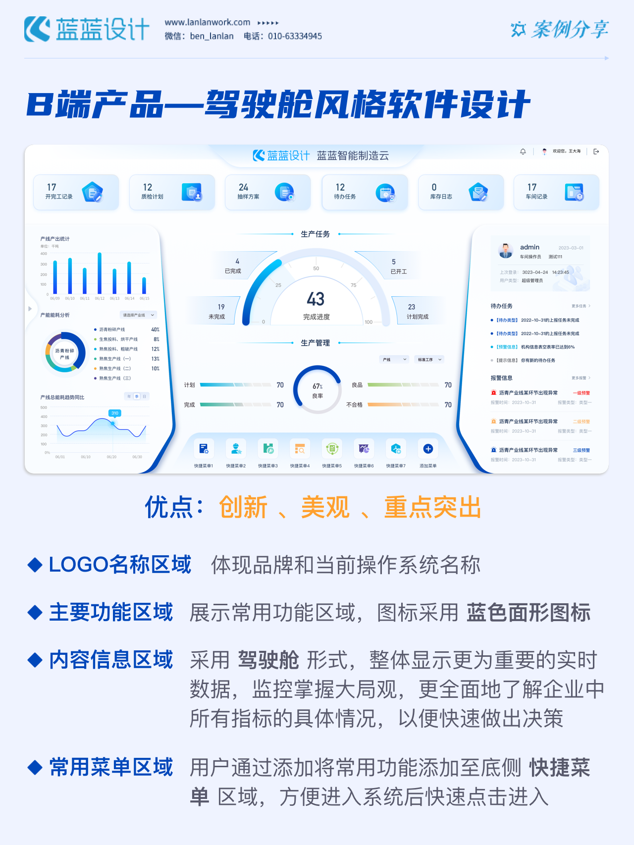 方案二:平臺主頁風(fēng)格 在初步調(diào)研產(chǎn)品框架的基礎(chǔ)上,系統(tǒng)首頁重構(gòu)信息組織架構(gòu),豐富信息和數(shù)據(jù),根據(jù)不同權(quán)限可調(diào)整頁面信息增加辦公效率。設(shè)計風(fēng)格采用簡約的設(shè)計語言,模塊化布局,方圓并構(gòu)的設(shè)計模式,界面強調(diào)可復(fù)用性和通用性,配色采用品牌色,品牌融合度高。