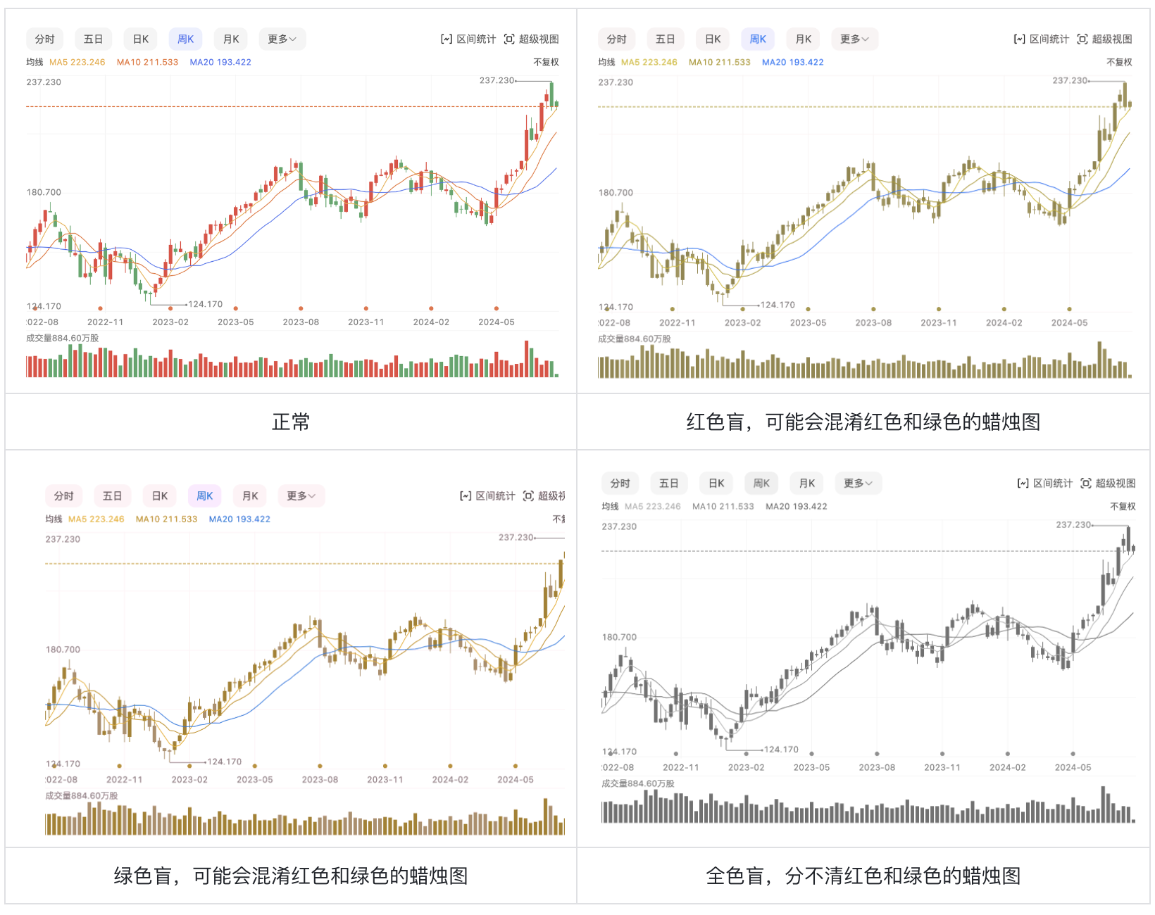 全色盲投資者更是由于只能感知明暗,在遇到這類過度依賴顏色且缺乏其他輔助元素的圖表時,幾乎無法從中獲取有效的信息,難以全面理解市場分析的要點和趨勢。