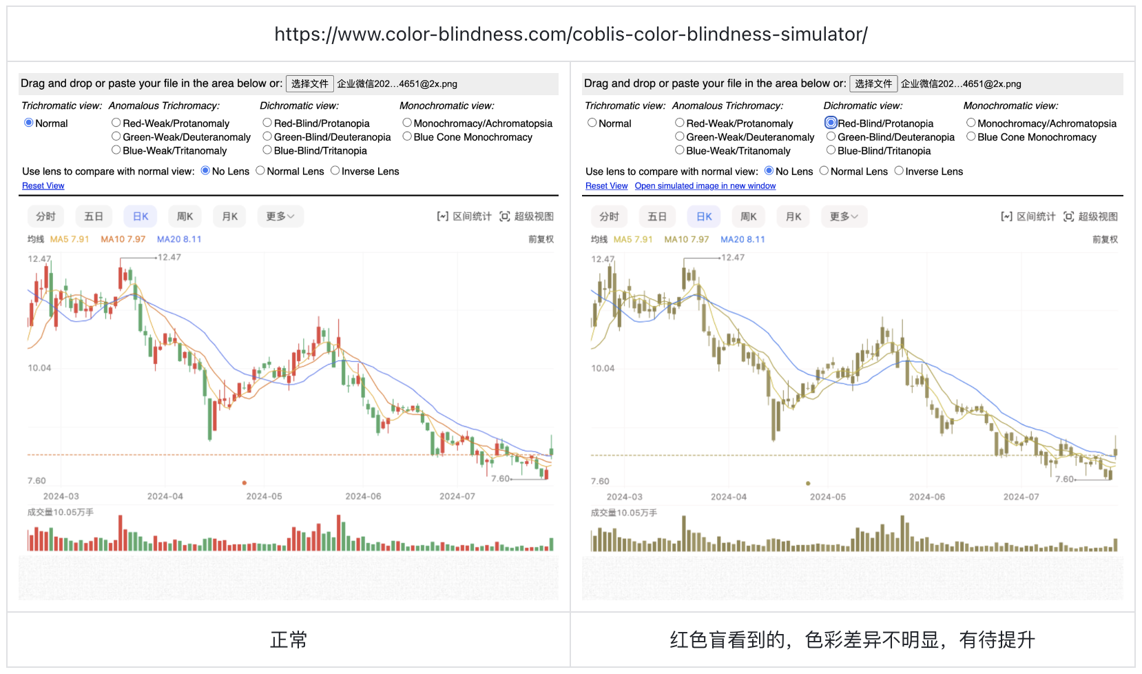 在股票市場中,顏色編碼是信息傳達的重要手段。許多分析工具使用紅色和綠色來表示虧損和盈利,這種直觀的視覺信號對大多數投資者十分有效。然而,色盲投資者在分析市場動態(tài)時,往往因無法準確分辨這些顏色而產生誤解,影響他們的決策能力。例如,紅綠色盲的投資者在分析股票個股時,可能會混淆紅色和綠色的蠟燭圖,導致錯誤的投資判斷。