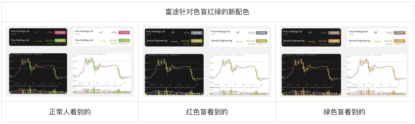 以富途 APP 為例,2022 年,富途依據用戶的反饋和測試,對原先僅依賴顏色的圖表予以改進,轉變?yōu)轭伾c符號相結合的設計。這一改變極大地提升了用戶的滿意度。在改進過程中,富途精心篩選了所有紅綠色系的配色,將設計稿應用于插件進行效果測試,并邀請色覺障礙人士參與其中。經過不懈努力,他們在多樣的色帶組合里找到了全新的配色方案。