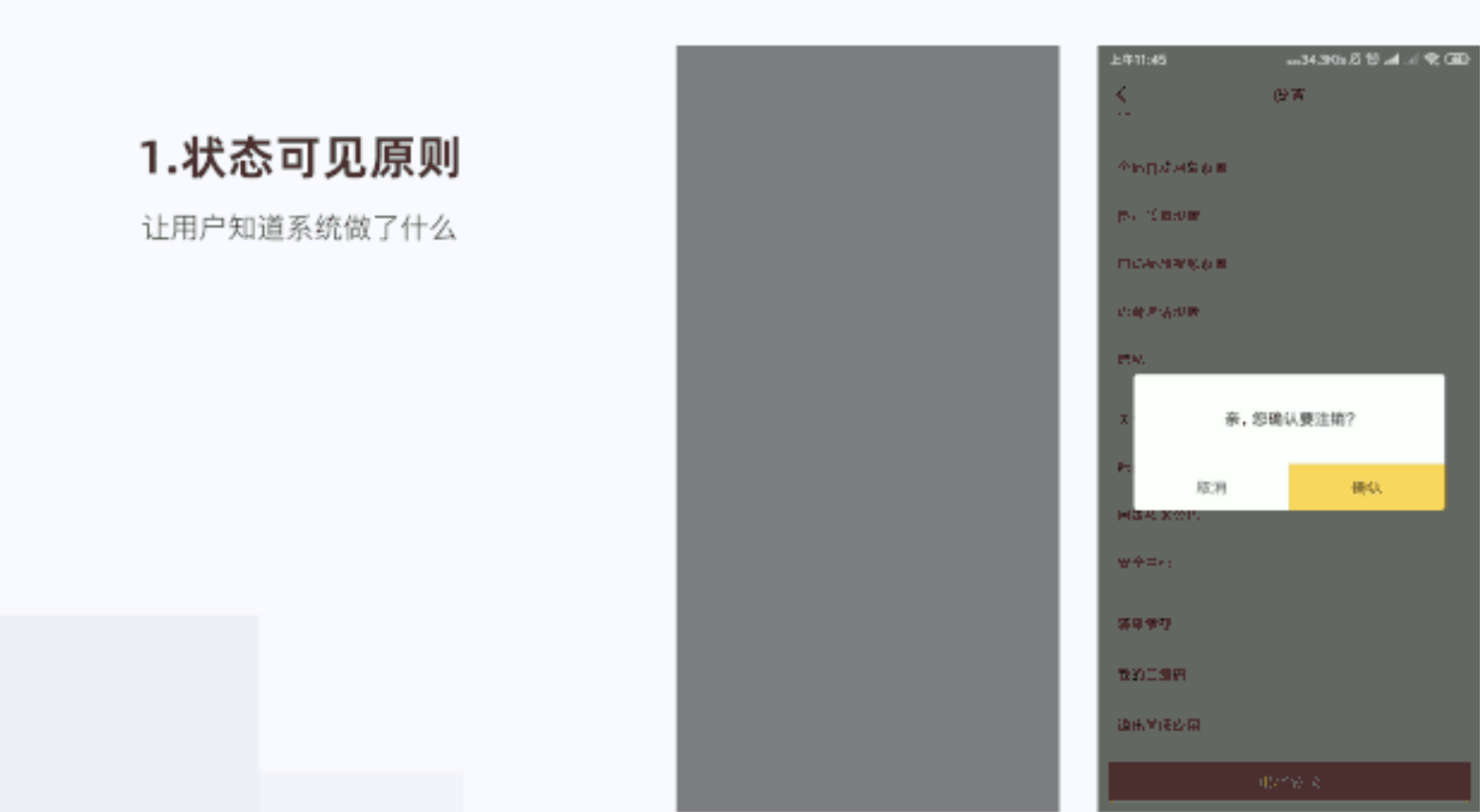 在退出登錄提示是否要注銷登錄,把確認(rèn)層級加大,放在右邊,清晰提示用戶,防止用戶出錯