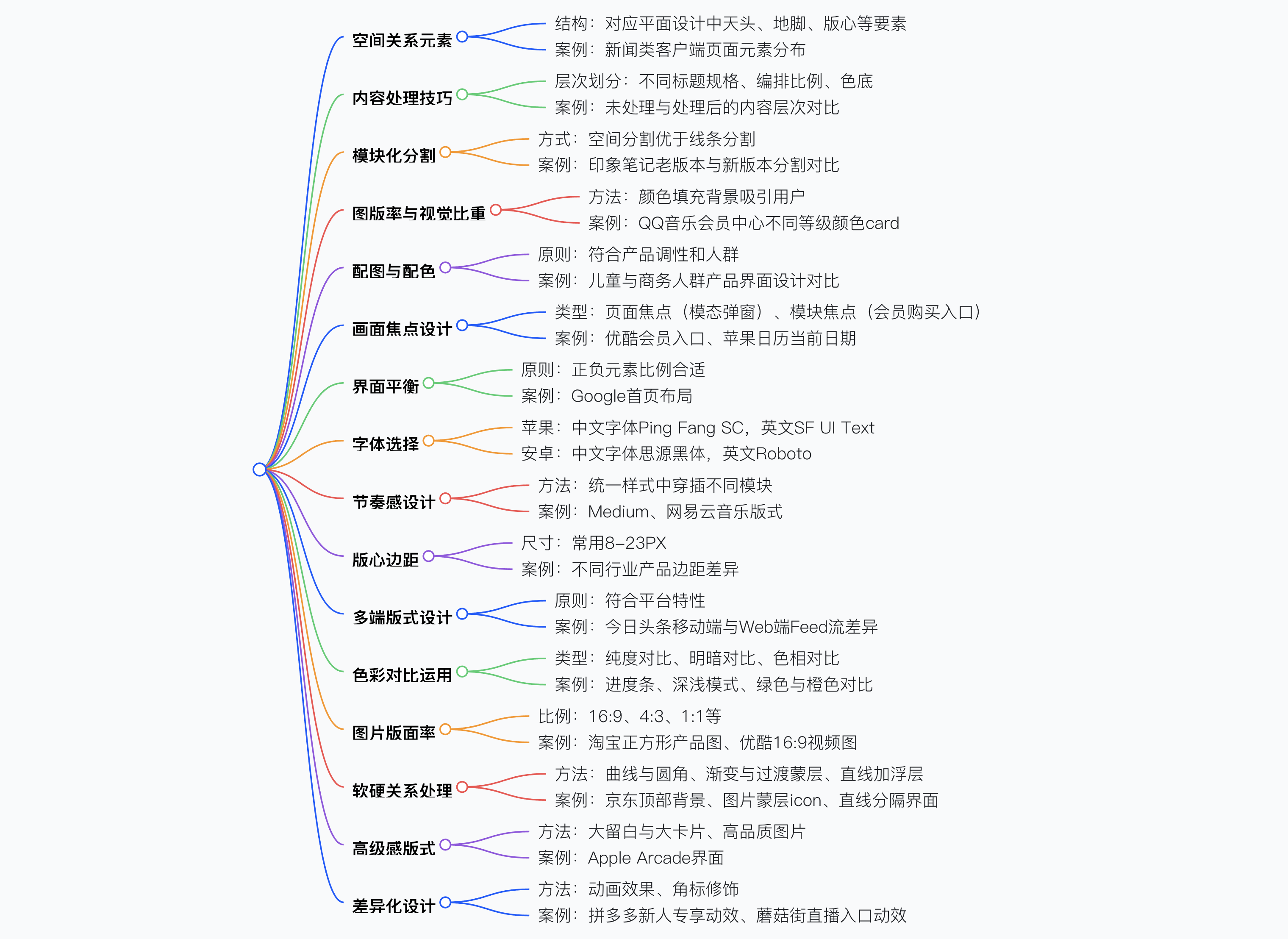 UI 界面版式設計的實用技巧,包括運用平面設計結構理解界面空間元素分布,通過不同標題規(guī)格等處理內容過多問題,采用空間分割替代線條分割,利用顏色填充背景改變圖版率,根據產品調性選擇配圖及配色,通過模態(tài)彈窗等突出畫面焦點,注重界面平衡,選擇合適字體(蘋果常用 Ping Fang SC、SF UI Text 等,安卓常用思源黑體、Roboto 等),設計有節(jié)奏感的版式,參考常用版心邊距(8-23PX),考慮多端平臺特性進行版式設計,運用純度、色相對比等色彩對比手法,有效利用 16:9 等圖片版面率,通過曲線與圓角等處理版式軟硬關系,利用大留白與大卡片營造 “高級感”,采用增加動畫效果等差異化設計方法。