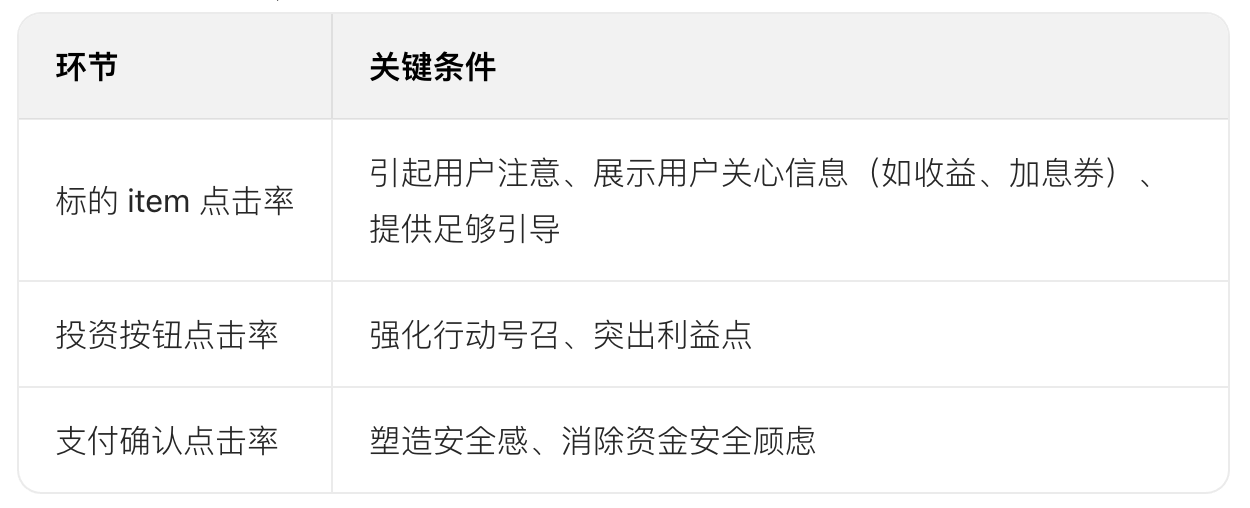 - 提升投資按鈕點(diǎn)擊率:優(yōu)化按鈕文案(如 “立即投資” 突出行動(dòng)),強(qiáng)化利益描述(如 “預(yù)期收益 34.52 元 + 12.33 元已加息”)。
