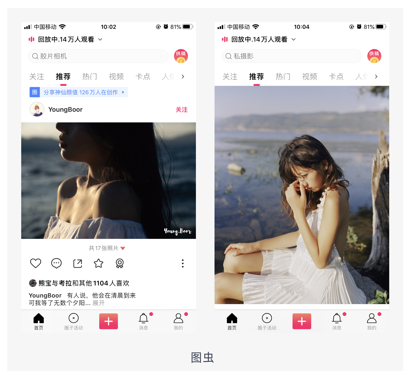 • 隨圖片而變化:當(dāng)用戶(hù)上傳不同比例的圖片時(shí),圖片展示寬度為屏幕寬度,展示高度根據(jù)確定的寬度等比例縮放。這種適配方式能將圖片信息表達(dá)完善,但圖片占用空間大,適合圖片質(zhì)量高、用戶(hù)以瀏覽圖片為主的產(chǎn)品,如圖蟲(chóng)。不過(guò)需要注意的是,采用該方式需要設(shè)置最大最小閾值,當(dāng)圖片的高度超過(guò)一定數(shù)值,高度就不再增加,當(dāng)圖片的高度小于一定數(shù)值,高度不再減小。