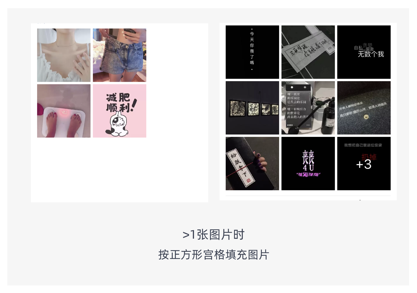 • 微信九宮格布局:當(dāng)圖片為一張,且 0.5 ≤ 寬 / 高 ≤ 2 時(shí),高度 360px,寬度根據(jù)比例縮放;當(dāng)圖片為一張,寬 / 高 <0.5 時(shí),高度 360px,寬:高 = 1:3 顯示;當(dāng)圖片為一張,寬 / 高> 2 時(shí),高度 360px,圖片占橫向 3 格;當(dāng)圖片多于一張時(shí),直接將圖片適配到格子里。