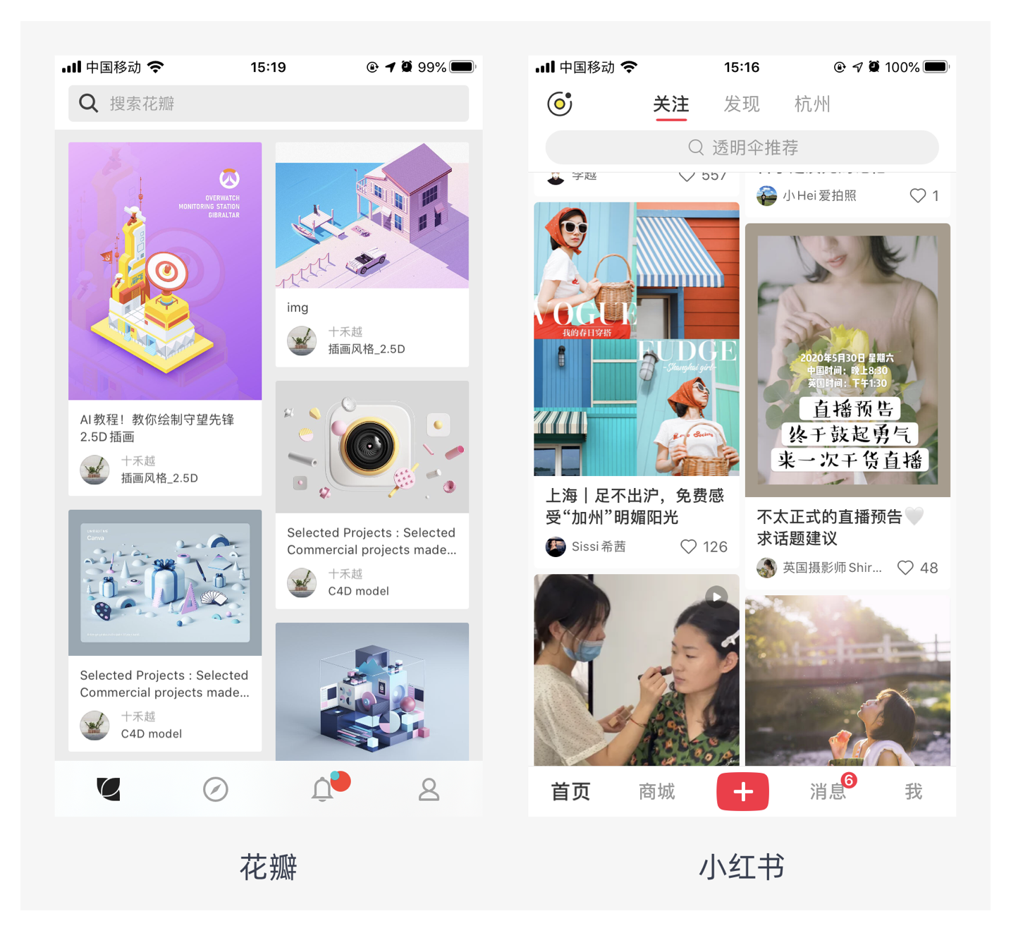 瀑布流式布局的視覺(jué)表現(xiàn)為參差不齊的多欄布局,用戶(hù)的視線(xiàn)軌跡以 Z 型為主,這種軌跡易于閱讀。但由于用戶(hù)采用 “就近原則” 閱讀信息,容易產(chǎn)生漏讀現(xiàn)象。它適用于社區(qū)類(lèi)瀏覽型頁(yè)面,這類(lèi)頁(yè)面往往信息量大,采用瀑布流式布局能讓瀏覽體驗(yàn)更為流暢,如花瓣、小紅書(shū)等平臺(tái),用戶(hù)可以不斷下拉獲取更多內(nèi)容,沉浸在瀏覽過(guò)程中。