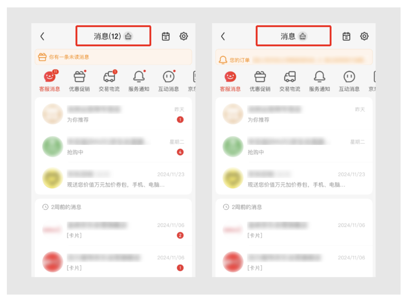 拼多多、京東、美團(tuán)這類 APP,未讀消息大多是促銷、物流、商家群發(fā),即時性強但 “長期價值低”。比如拼多多的 “拼單成功通知”、美團(tuán)的 “優(yōu)惠券過期提醒”,用戶看完一次就沒用了,攢多了只會占地方。