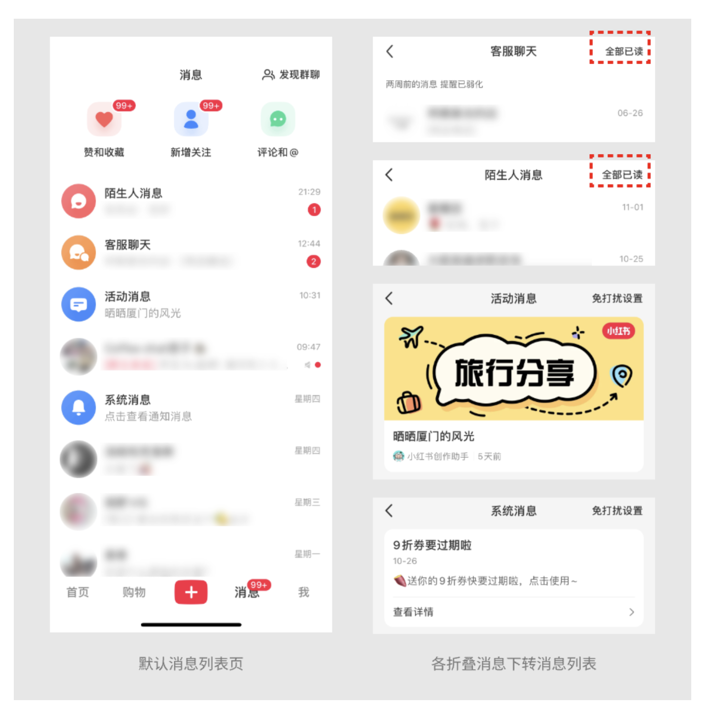 但到了 “客服聊天” 和 “陌生人消息” 里,“全部已讀” 就出現(xiàn)了。客服消息大多是 “訂單咨詢”“售后反饋”,事情解決后就成了沒用的歷史記錄;陌生人消息里可能有營銷騷擾,默認(rèn)折疊還能避免打擾。我上次在小紅書買衣服,和客服聊完尺碼后,點 “全部已讀” 把對話清掉,消息頁瞬間清爽,也不會誤刪重要的社交消息。