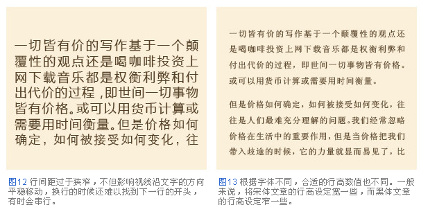 行高,行間距的大小對(duì)文章的易讀性有很大的影響。行與行之間拉得過開,從一行末尾移動(dòng)到下一行開頭,視線的移動(dòng)距離過長(zhǎng)增加了閱讀難度。相反,行與行之間貼得過緊,上下挨得過緊影響了視線的移動(dòng),讓人不知道正在閱讀哪一行(圖12)。正文最恰當(dāng)?shù)男懈?,基本?yīng)該設(shè)定為其文章中文字大小的兩倍。例如文字大小為8px的文章,就應(yīng)該把行高設(shè)定為16px(圖13)
