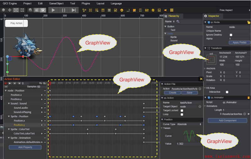 整個(gè) QICI Engine 的 HTML5 游戲引擎編輯工具就是基于 HT 組件定制開發(fā)出來的,上圖刀塔場景的資源管理器就是圖標(biāo)可縮放,圖集可展開合并,可縮小變成樹層次的 GraphView 拓?fù)鋱D,而第二張的動(dòng)作編輯器、曲線編輯器等等部分也都是 GraphView 的身影。