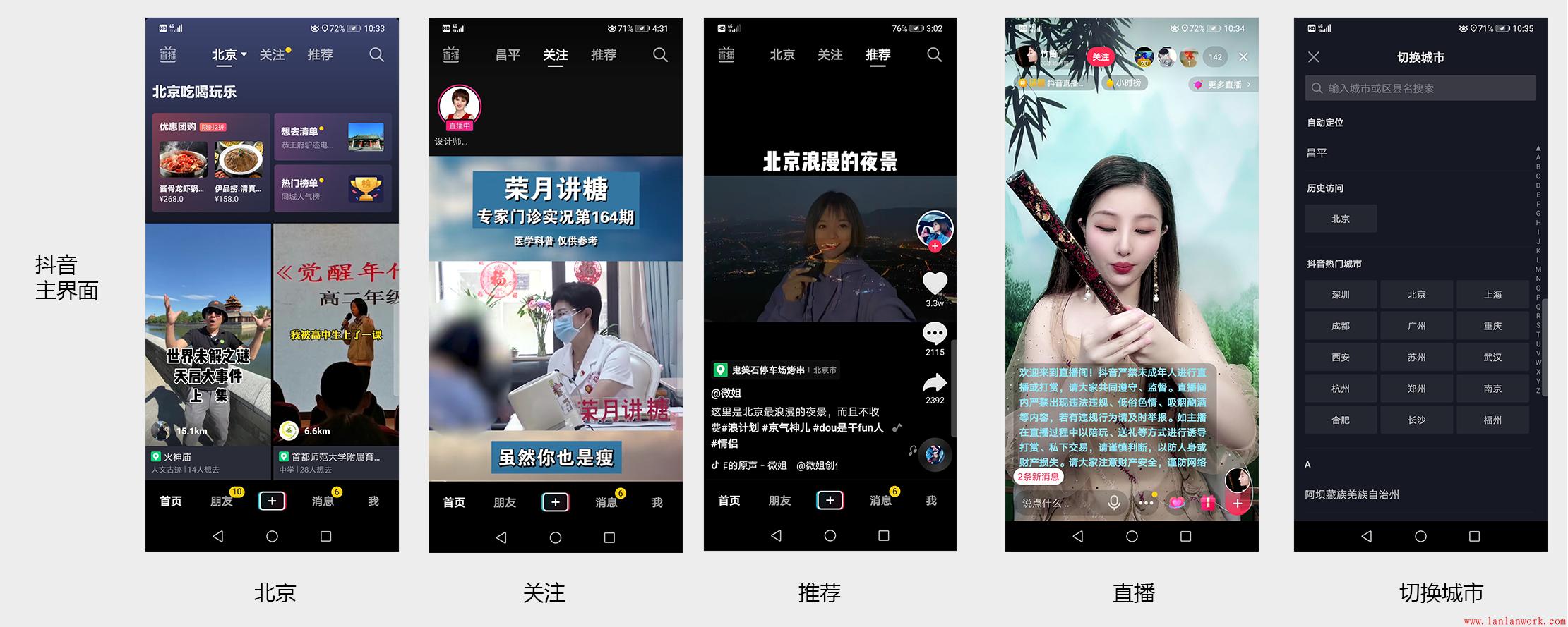 在內(nèi)容的布局上,抖音基本上各欄目就是一頁寬度放一個(gè)視頻,北京欄目下部放了2列。刷一次屏得到一個(gè)內(nèi)容,相對選擇性差。對于新用戶,這可能是個(gè)盲點(diǎn)。