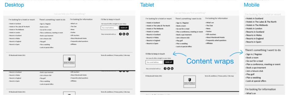 我們將使用一個真實的酒店網(wǎng)站 作為范例,來演示響應(yīng)式Web設(shè)計的流程。這個網(wǎng)站是我們在九月份剛剛為Macdonald連鎖酒店創(chuàng)建的。在整個設(shè)計開發(fā)流程中,有幾個關(guān)鍵步驟,是我們接下來要逐一展開學習的: