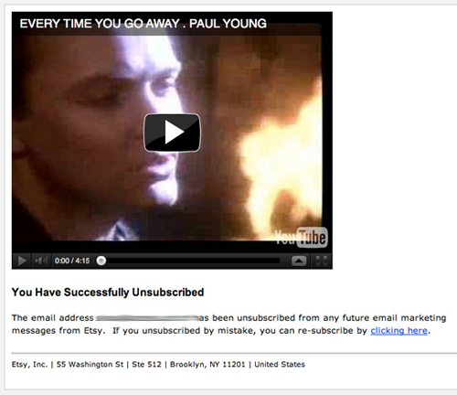 Etsy 會(huì)在用戶退訂之后播放Paul Young的"Every Time You Go Away"。這種方式無法讓用戶留下來,但可以給他們留下深刻的印象。當(dāng)用戶再一次在Etsy平臺(tái)上瀏覽商品時(shí),多半會(huì)想起這個(gè)有意思的小環(huán)節(jié),或許他們無論在哪里聽到這首歌的時(shí)候還會(huì)想到Etsy呢。
