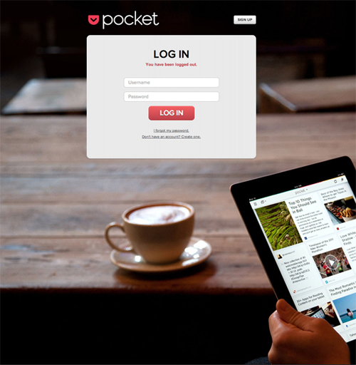 在很多時(shí)候你未必需要做的如此特別。以Pocket 為例,他們的登錄頁面具有很強(qiáng)的“歡迎”色彩,一幅巨大的背景圖片烘托出了該應(yīng)用的使用場景,讓用戶覺得身臨其境,在情緒上產(chǎn)生共鳴。