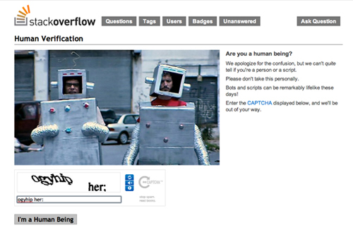 驗(yàn)證工具Captcha在如今被很多網(wǎng)站所使用,但這不意味著用戶真的喜歡這東西,很多時(shí)候Captcha確實(shí)會(huì)令人感到煩惱和挫敗。我們暫時(shí)無法改變這個(gè)工具本身的工作機(jī)制,但至少可以像Stack Overflow那樣通過一幅有趣的圖片搭配說明文案,向用戶解釋為什么要使用這個(gè)煩人的工具,籍此獲得用戶的理解,減少負(fù)面情緒的產(chǎn)生。