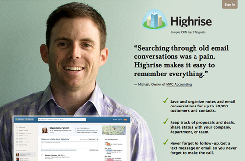通過這張圖片,Highrise 向我們展示了一個(gè)快樂的人,還有他使用該公司產(chǎn)品的故事。來自實(shí)際客戶的微笑以及贊許之辭,這是非常正面的、非常容易促使?jié)撛谟脩粽J(rèn)同并期望獲取其產(chǎn)品的宣傳形式。