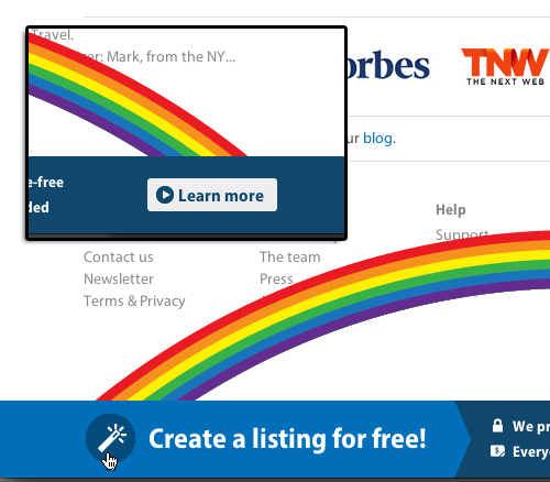 驚喜 :瀏覽到頁腳,你會(huì)發(fā)現(xiàn)鼓勵(lì)你免費(fèi)創(chuàng)建活動(dòng)的圖標(biāo)與文案,當(dāng)鼠標(biāo)懸停在圖標(biāo)上的時(shí)候,一道絢麗的彩虹會(huì)突然冒出來,它的動(dòng)畫效果所指向的正是引導(dǎo)用戶這個(gè)操作的按鈕。