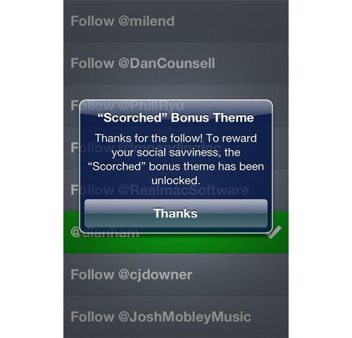 另外,如果你follow了Clear開發(fā)者的Twitter帳號(hào),那么還能獲取另外一款獎(jiǎng)勵(lì)主題。這個(gè)彩蛋的作用依然在于傳播。人們會(huì)分享他們的熱忱,甚至談?wù)撍麄儷@得或是錯(cuò)過了哪些主題。