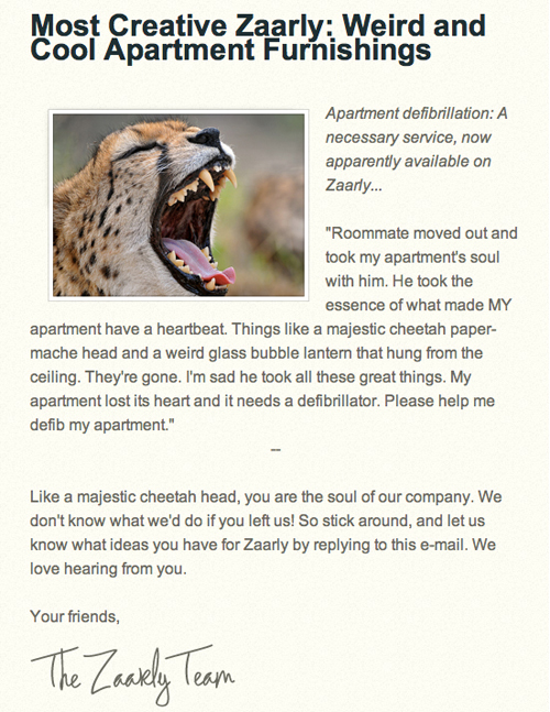 Zaarly在他們的郵件快報(bào)中講了一些具有神秘色彩的小故事,這種方式提升了郵件的吸引力,使用戶不由自主的對(duì)其中的內(nèi)容以及這個(gè)網(wǎng)站提供服務(wù)產(chǎn)生好奇,而不是一味的排斥。
