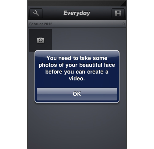 在"Everyday"應(yīng)用當(dāng)中,如果你還沒有向媒體庫中添加照片,那么系統(tǒng)就會(huì)非常友好的提示你去給自己“漂亮的臉蛋”拍些照片放到庫中——簡單的詞匯定義了提示信息甚至是產(chǎn)品的基調(diào),換句話說,就是個(gè)性。