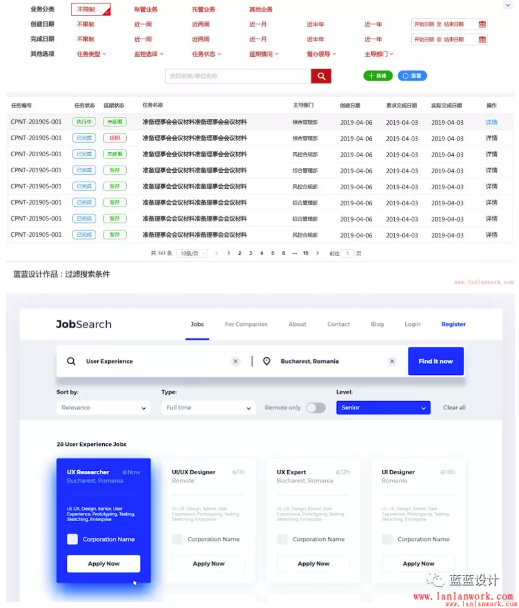 大多數(shù)表格的前面都有搜索過(guò)濾功能,如果搜索條件相當(dāng)多,可以精選一部分主要的排成一行,其他的隱藏,點(diǎn)箭頭再出現(xiàn)。整個(gè)搜索區(qū)域也可以有隱藏/顯示的按鈕,來(lái)給下面的表格更多的空間。