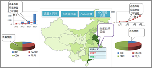 在分省概況模塊里有四個小的模塊。分別是流量本網(wǎng)率、點擊本網(wǎng)率、Cache流量、IDC服務(wù)流量。