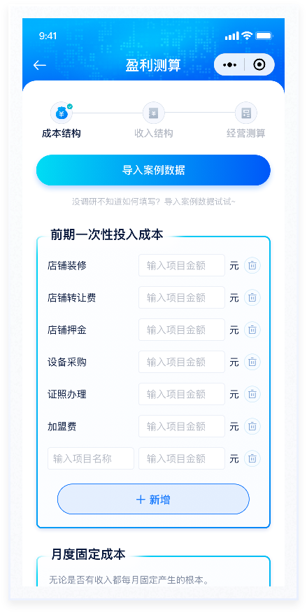 所盈利測(cè)算功能是產(chǎn)品的主要功能,通過AI對(duì)未來開店盈虧情況進(jìn)行預(yù)測(cè)評(píng)估。本次設(shè)計(jì)主要優(yōu)化該流程的交互及視覺表現(xiàn),整個(gè)流程分為“成本結(jié)構(gòu)”“收入結(jié)構(gòu)”“經(jīng)營測(cè)算”三個(gè)階段,過程填寫情況放置在頁面頂部,一步了然。已填寫使用主題色標(biāo)注,未填寫則使用置灰顏色處理,符合用戶基本感知。按鈕使用與主色相近的漸變色。
