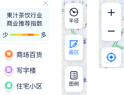 按鈕換膚在地圖上,“半徑”“選區(qū)”便于用戶對(duì)開店范圍的選擇,“圖例”則更側(cè)重圖標(biāo)說明性?!胺糯蟆薄翱s小”“定位”則是對(duì)顯示內(nèi)容的操作。